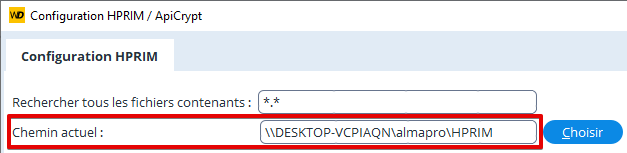 Pour cela, rendez vous dans « HPRIM » → « Configuration HPRIM / ApiCrypt » puis renseignez le chemin réseau. Dans notre cas, le chemin réseau est « \\DESKTOP-VCPIAQN\almapro\HPRIM » :