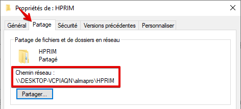 Faîtes un clic-droit sur le répertoire « HPRIM », cliquez sur « Propriétés », dans l’onglet « Partage », récupérez le « chemin réseau » (il peut être sélectionné puis copié) :