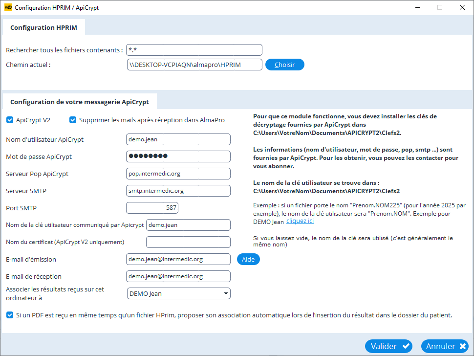 La première étape consiste à indiquer à AlmaPro d’enregistrer les résultats et les documents reçus via ApiCrypt dans le répertoire HPRIM du poste serveur.