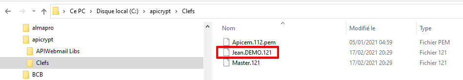 Dans C:\apicrypt\Clefs le fichier est nommé "Jean.DEMO.121" (copie écran ci-dessous).