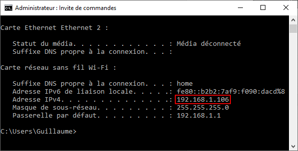 Si le nom du PC ne fonctionne pas, utilisez son adresse IP, sur le PC partageur, ouvrez une invite de commande et tapez : « ipconfig ».