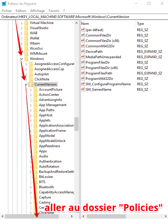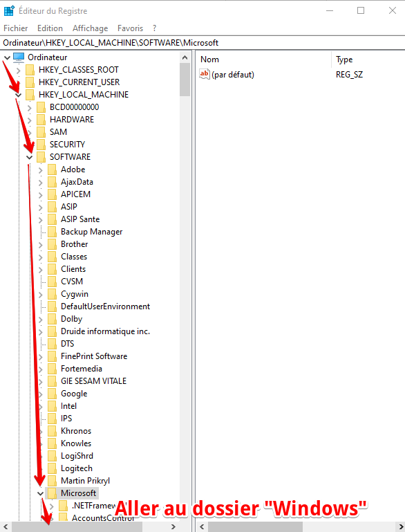 Naviguer dans l'arborescence de gauche de la base registres et aller dans le dossier ci-dessous :