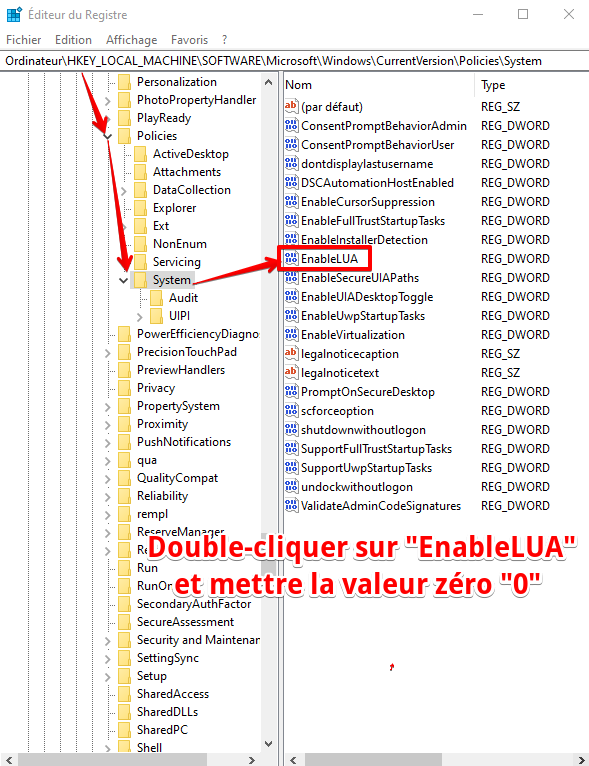 Dans la zone de droite, double cliquez sur la valeur "EnableLUA"