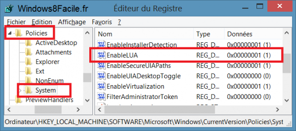 Si vous souhaitez réactiver l'UAC (contrôle des comptes utilisateurs) il faut remodifier «EnableLUA» en remettant sa valeur à «1» afin de revenir à la position initiale.