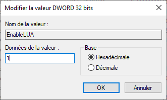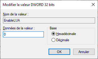 Modifier « EnableLUA » en passant sa valeur à « 0 » puis cliquez sur OK.