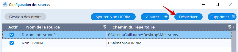 23.2.3. Désactiver une source de documents Désactiver une source permet de ne plus lister ses documents sans pour autant la supprimer. Dans le gestionnaire de documents, cliquez sur : Sélectionnez la source à désactiver puis cliquez sur :