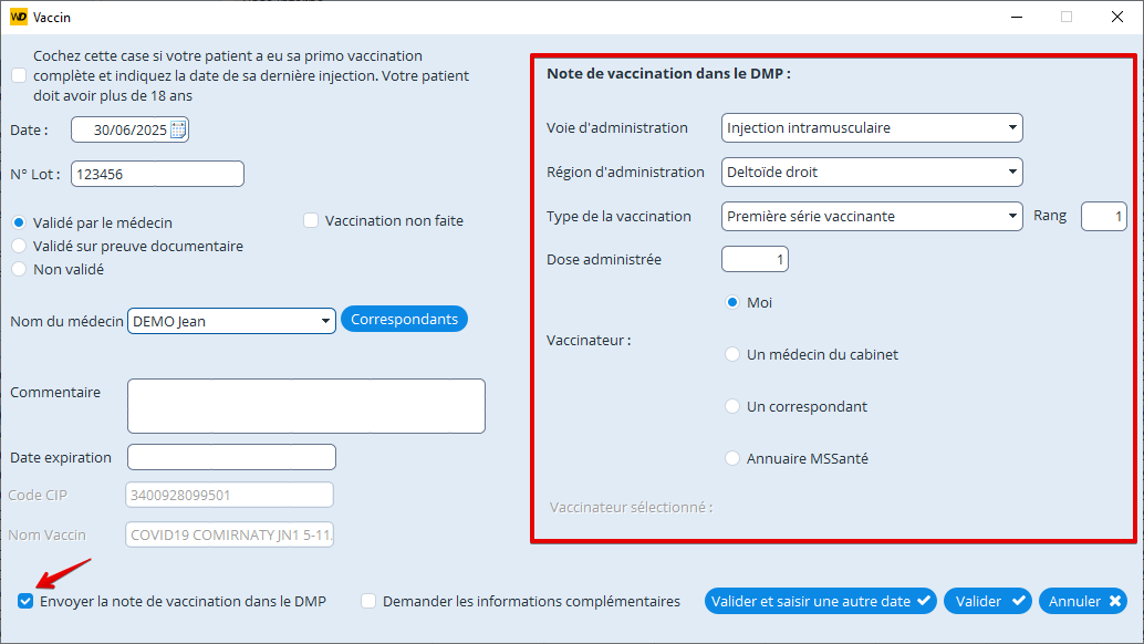 Pour transmettre une note de vaccination dans le DMP d'un patient, après avoir sélectionné un vaccin pour l'ajouter au carnet d'AlmaPro, cochez la case "Envoyer la note de vaccination dans le DMP", renseignez la partie droite de la fenêtre puis cliquez sur