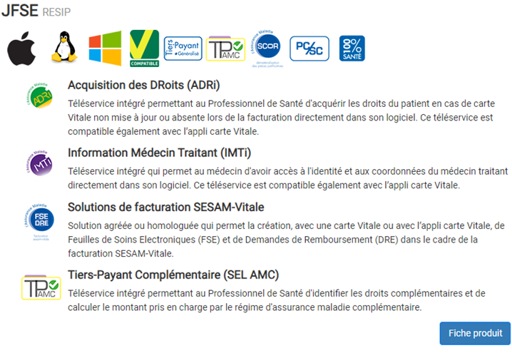 Cette solution permet de prendre en charge la lecture des cartes« CPS » et « Vitale », la rédaction et l'envoi des FSE et DRE et tout le suivi des flux vers les destinataires des régimes obligatoires et complémentaires.
