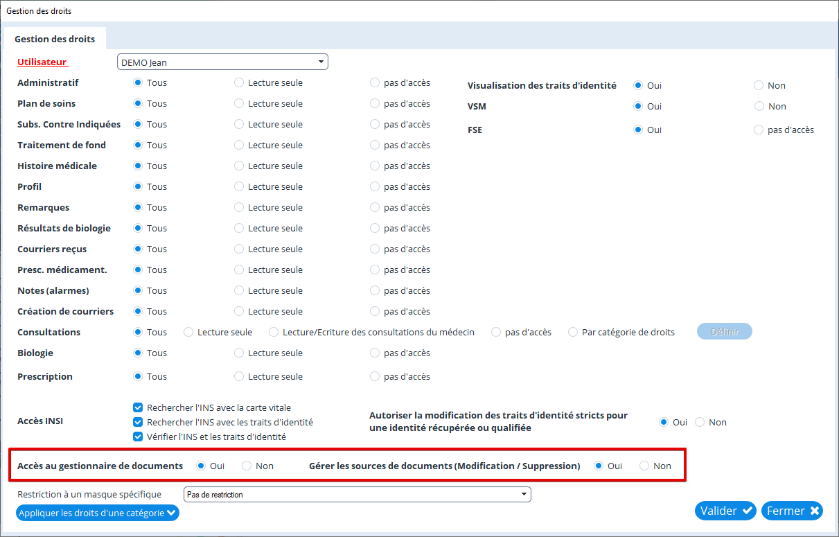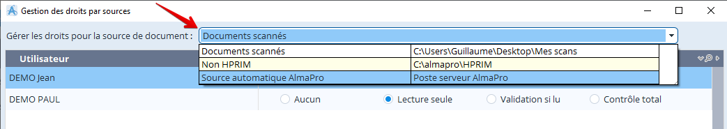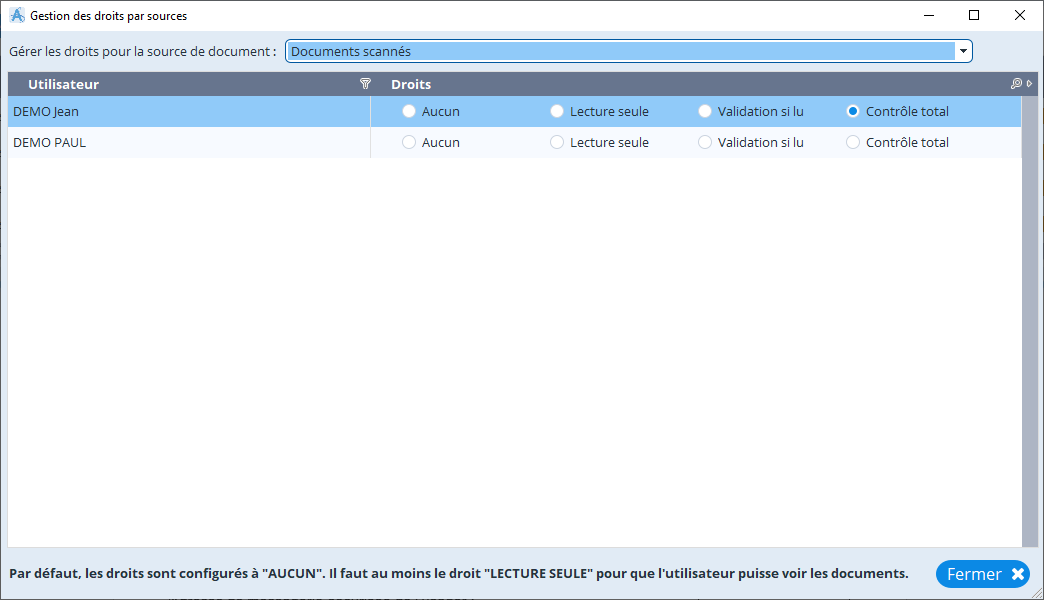 Il est également possible de double-cliquer sur la source de documents directement pour accéder à la fenêtre de gestion des droits.