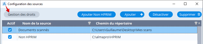 Pour accéder à la fenêtre de configuration des droits sur les sources de documents, dans le gestionnaire de documents, cliquez sur