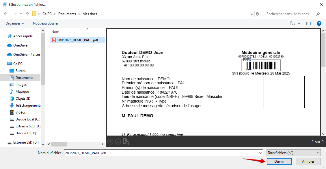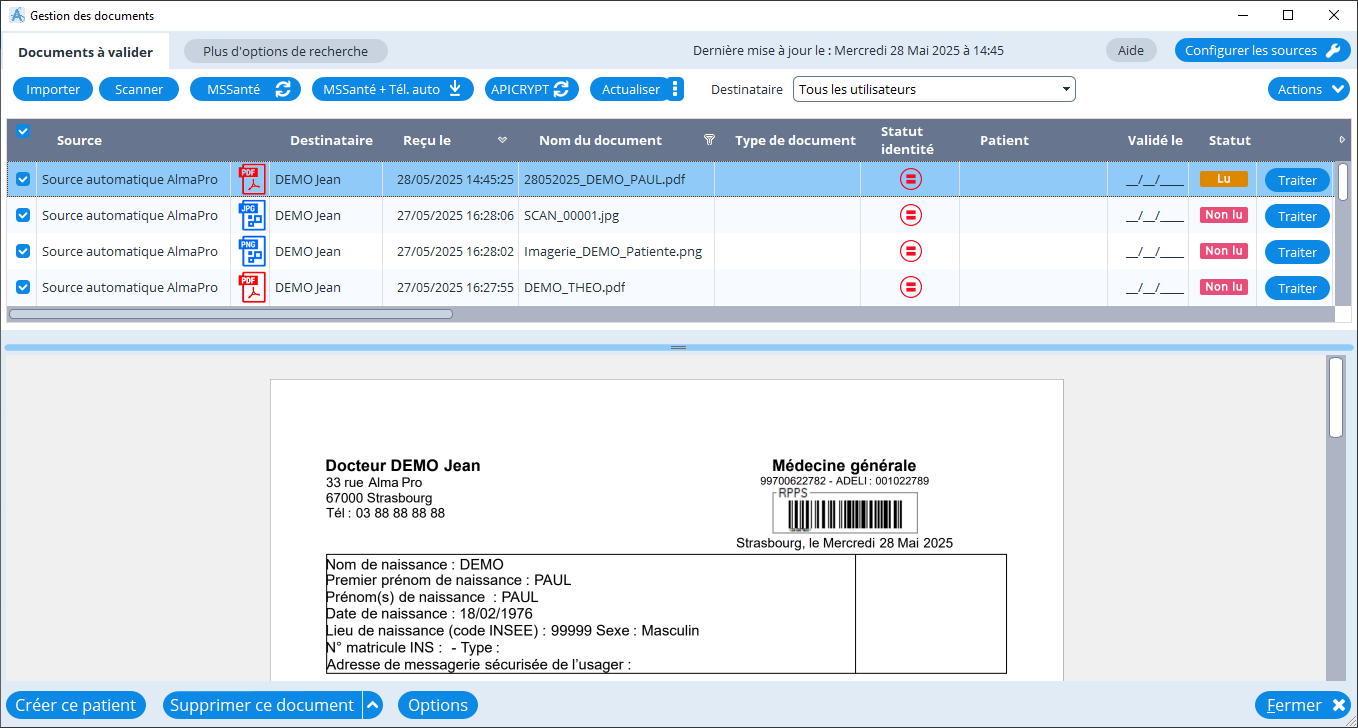 Le document sera ensuite affiché dans la liste du gestionnaire de documents et pourra être intégré dans le dossier de votre patient :