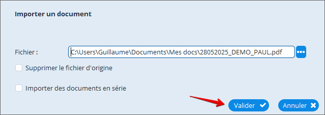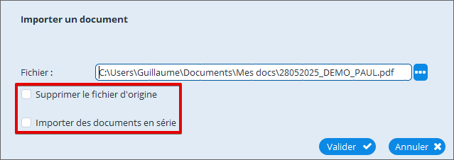 Importer des documents en série : Lorsque vous souhaitez importer plusieurs documents à la suite, la fenêtre d'import se ré-ouvrira après avoir importé chaque documents si vous cochez cette case.