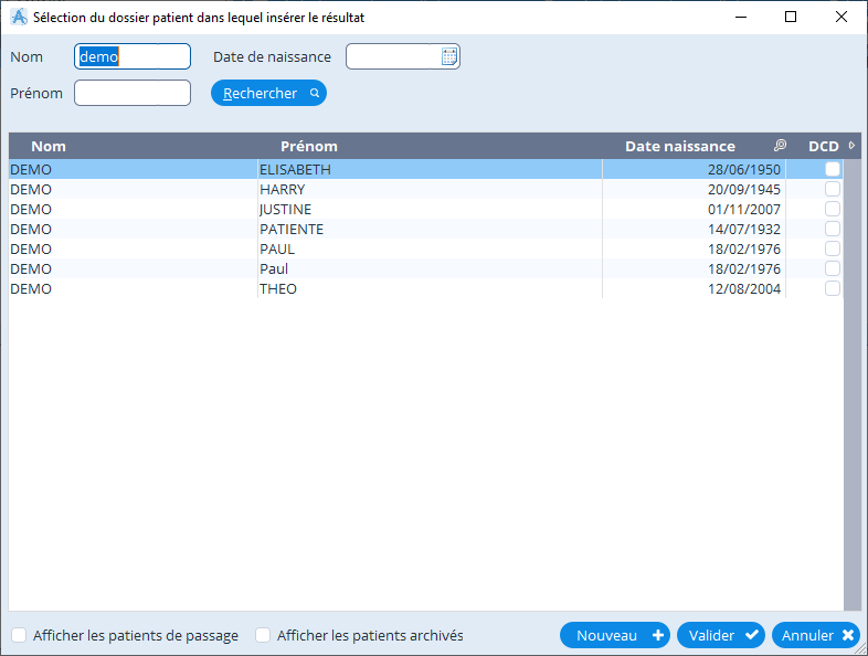 Une fenêtre vous permettra alors de créer le dossier patient s'il n'existe pas en cliquant sur "Nouveau" et ouvrira automatiquement la fenêtre des données administratives.