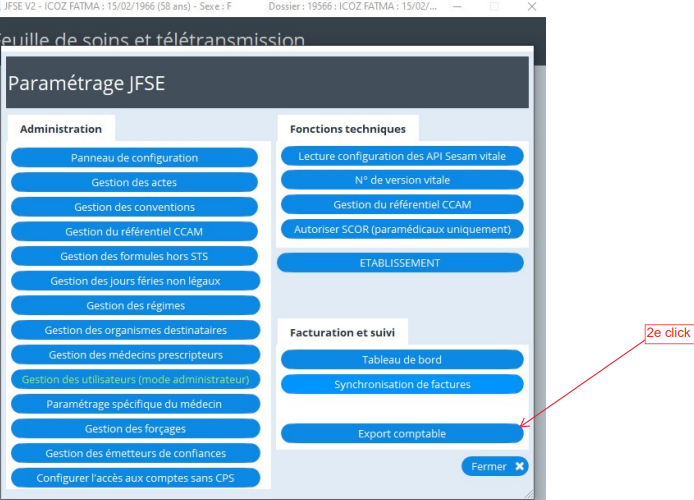 Le module de paiements de jFSE a été activé pour chaque beta testeur, mais il ne désactive pas l’export comptable d’AlmaPro pour autant. Ils ne sont pas accessibles depuis les même boutons ou pages :