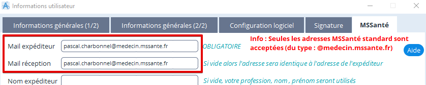 Pour MSSanté, il est uniquement nécessaire de renseigner votre adresse MSSanté dans votre profil utilisateur.