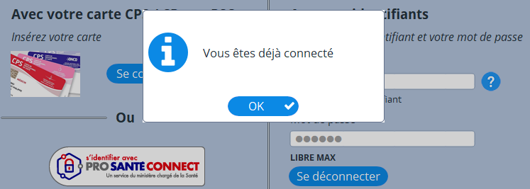 Si AlmaPro a déjà été ouvert avec votre carte CPS une fenêtre vous indiquera qu'AlmaPro est déjà ouvert par la CPS si vous cliquez sur