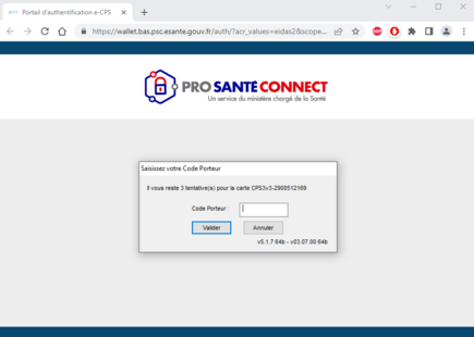 Le site Pro Santé Connect vous invitera à valider le certificat de votre carte CPS puis à saisir les quatre chiffres de votre carte CPS