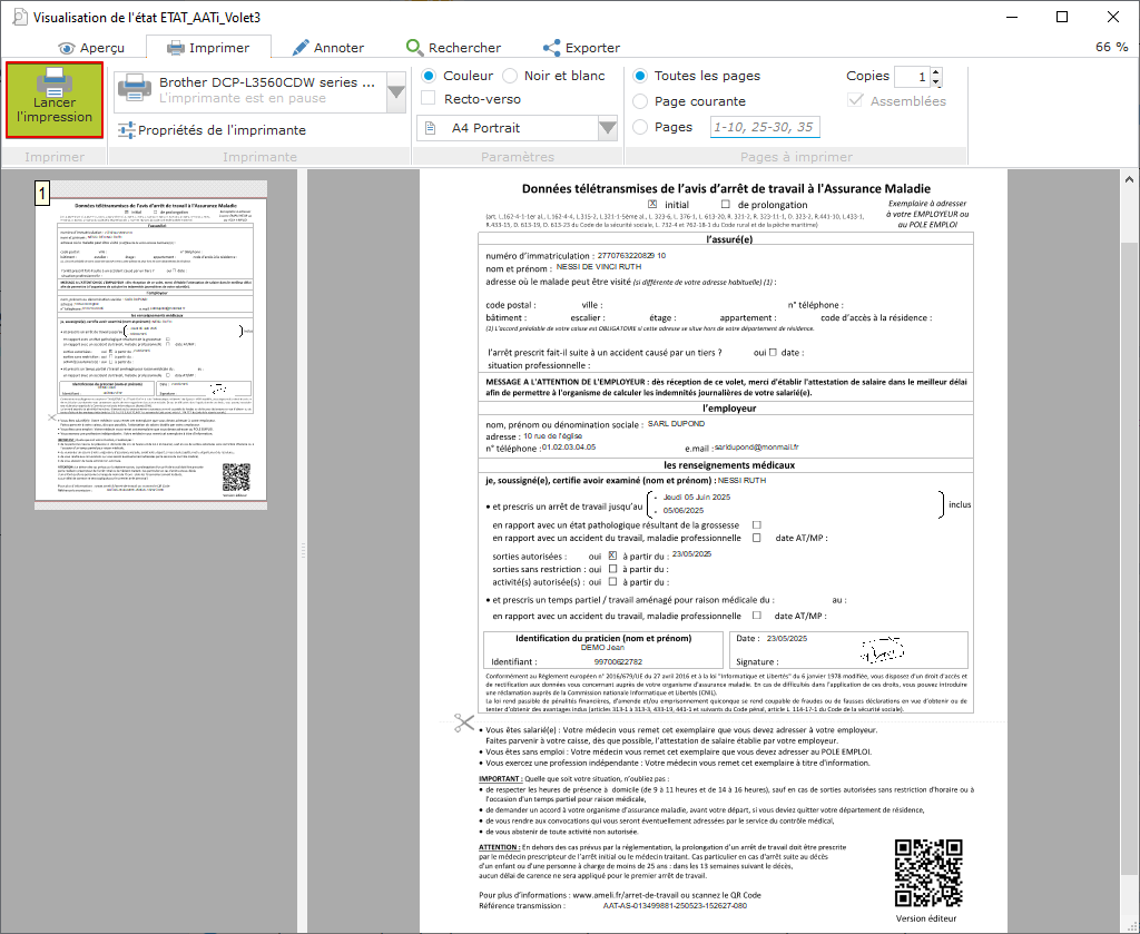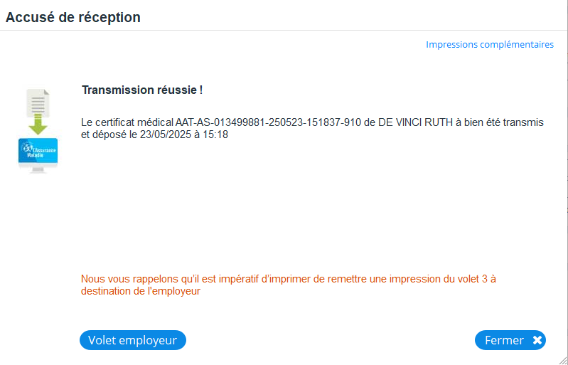 Avant de fermer cette fenêtre, vous devez fournir le « Volet employeur » au patient (excepté pour les non salariés agricoles), pour cela, cliquez sur le bouton