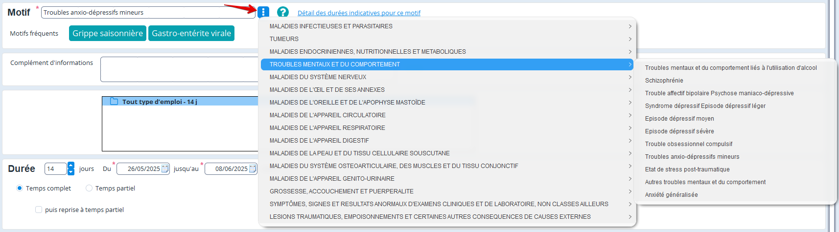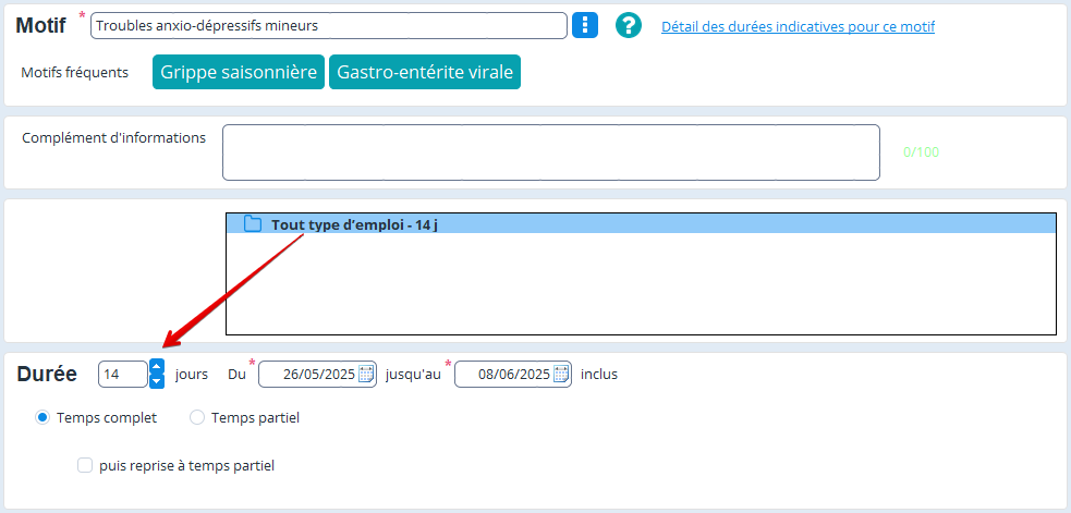 Le fait de sélectionner une durée indicative aura pour effet de pré-remplir la durée de l'arrêt de travail :