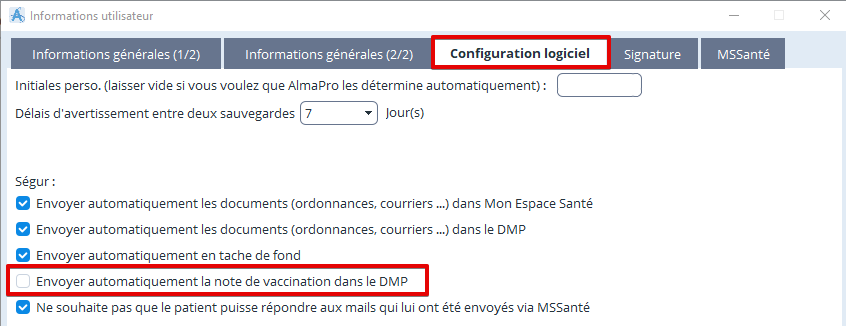 Il est possible de désactiver l'envoi automatique de la note de vaccination dans le DMP à partir de la fenêtre " Informations utilisateur".
