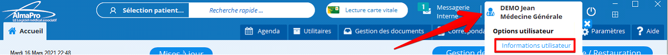 Si AlmaPro ne s'ouvre pas avec votre carte CPS cliquez sur votre "Nom", puis sur " Informations utilisateur " Puis faut aller dans