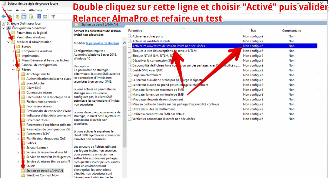 Aller dans "Stratégie Ordinateur local", puis dans "Configuration de l’ordinateur" choisir : Modèles d’administration \ Réseau \ Station de travail Lanman puis à droite