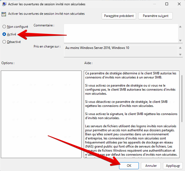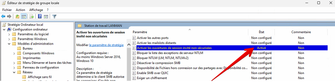Vérifier que la ligne "Activer les ouvertures de session invité non sécurisées" est "Activé"
