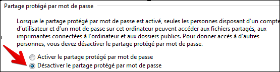 Vérifiez que l'option "Désactiver le partage protégé par mot de passe" est sur "Désactiver" sur le(s) poste(s) CLIENT et sur le poste SERVEUR.